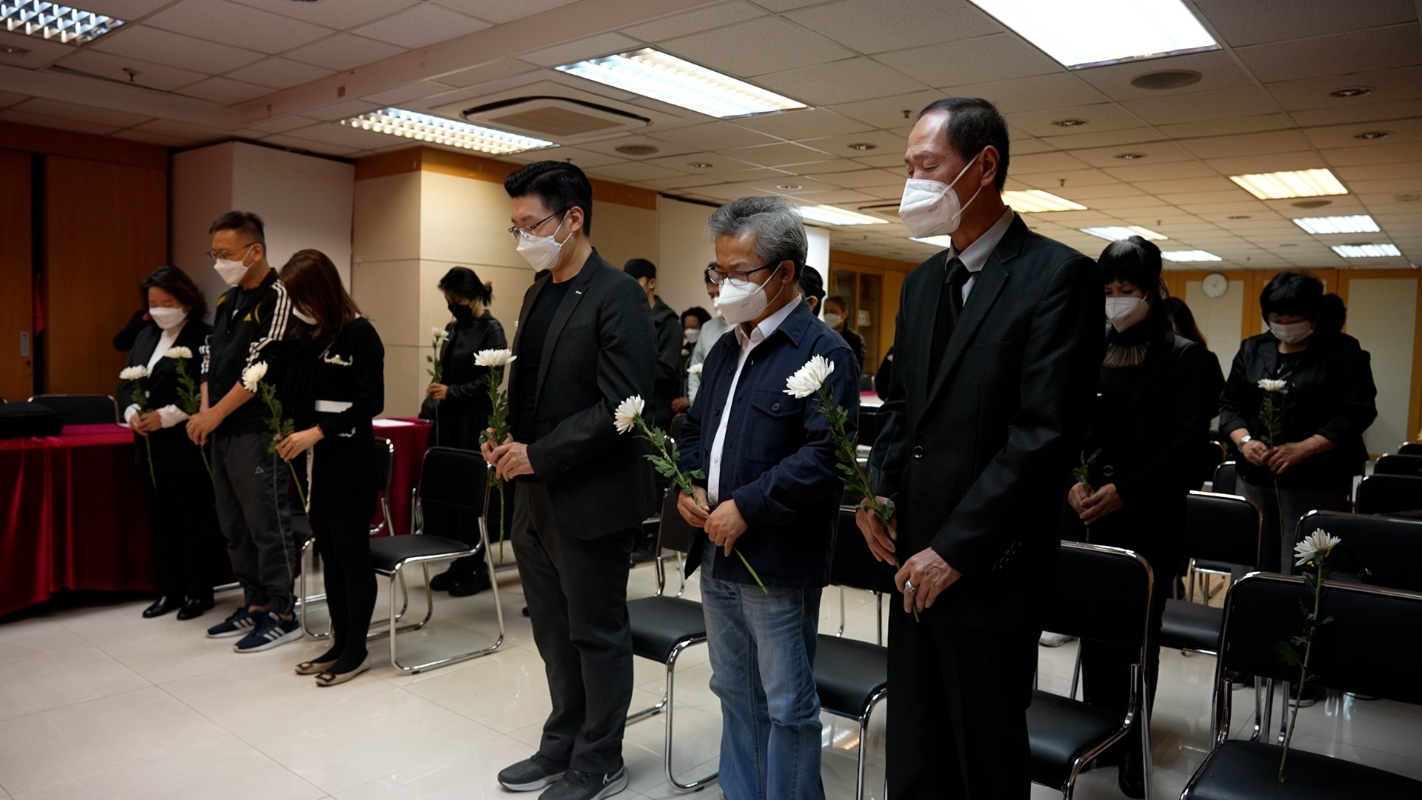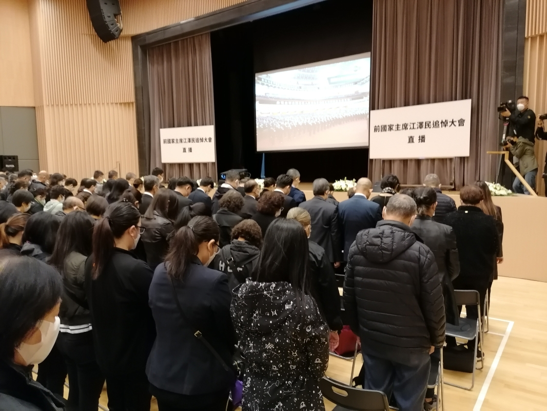 圖片來源:政府新聞處 當天早上九時半,立法會主席及立法會議員身著黑色正裝、戴白色口罩在立法會等候觀看追悼會直播。更有議員身穿中山裝,胸前配白菊以示悼念。追悼會期間,全體人員默哀,認真聆聽習主席致悼詞,儀式最後以三鞠躬結束,沈痛悼念江澤民。