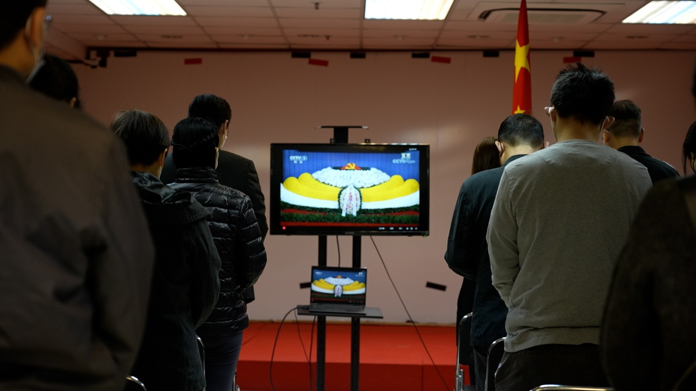 香港中通社記者 謝光磊攝 香港多個商場設點直播追悼會,不少市民在街頭、商場等的大型直播屏幕前駐足停留,神情哀傷。其餘商場亦在追悼會默哀期間,關掉電視屏幕。 不少市民身穿素色衣服,前往指定的21個社區會堂及活動中心觀看追悼會直播,民政事務處職員為市民提供鮮花及白色口罩,市民進場後獻花以示悼念。場內放置大批團體送贈的花圈。