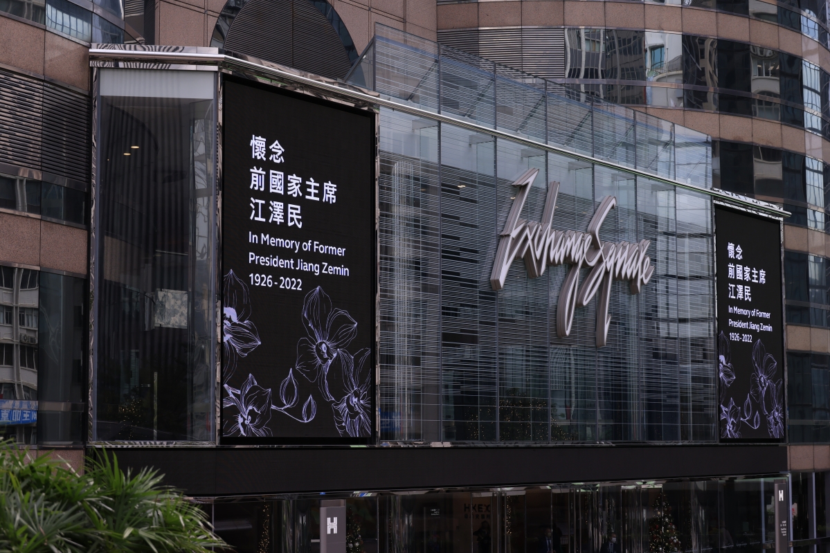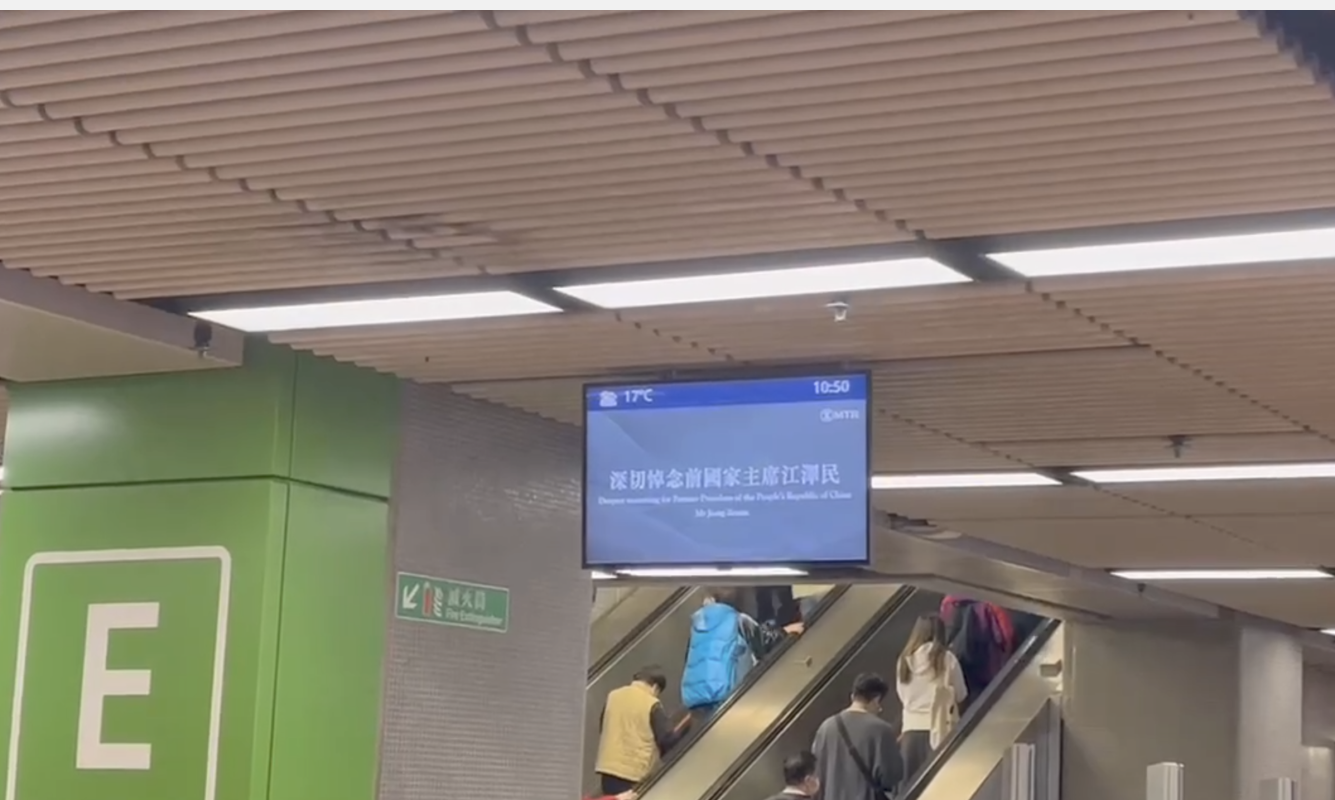 香港中通社圖片 追悼會期間,港鐵車站大堂的電子顯示屏發放悼念訊息,“深切悼念前國家主席江澤民”。