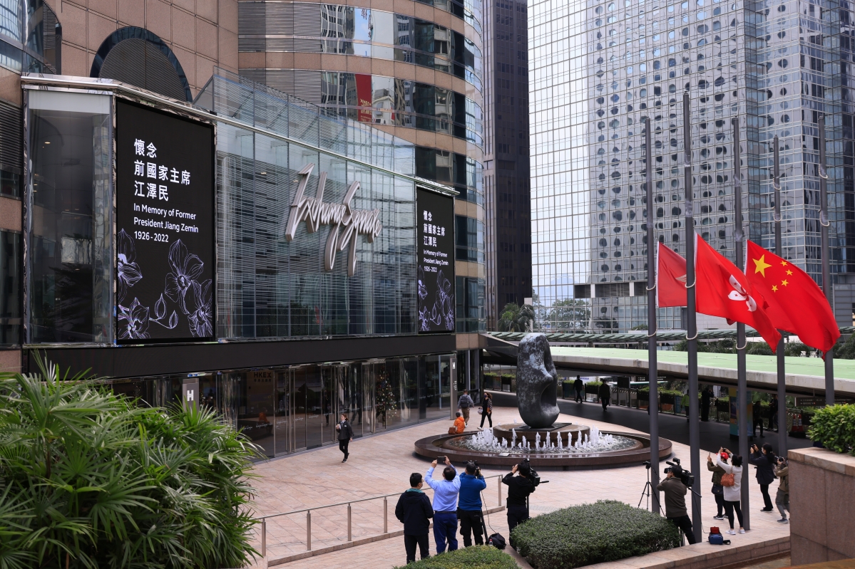 今天的香港,一改往日喧囂。 前國家主席江澤民11月30日在上海逝世,享年96歲。12月6日上午10時正,江澤民追悼大會在北京人民大會堂隆重舉行。同一時間,香港各界舉行追悼儀式,官民默哀,笛聲長鳴。 早上八時,灣仔金紫荊廣場,國旗、區旗隨國歌升起後徐徐下半旗。香港特區政府總部、香港中聯辦、駐港解放軍總部、全港學校、各機構下半旗誌哀。