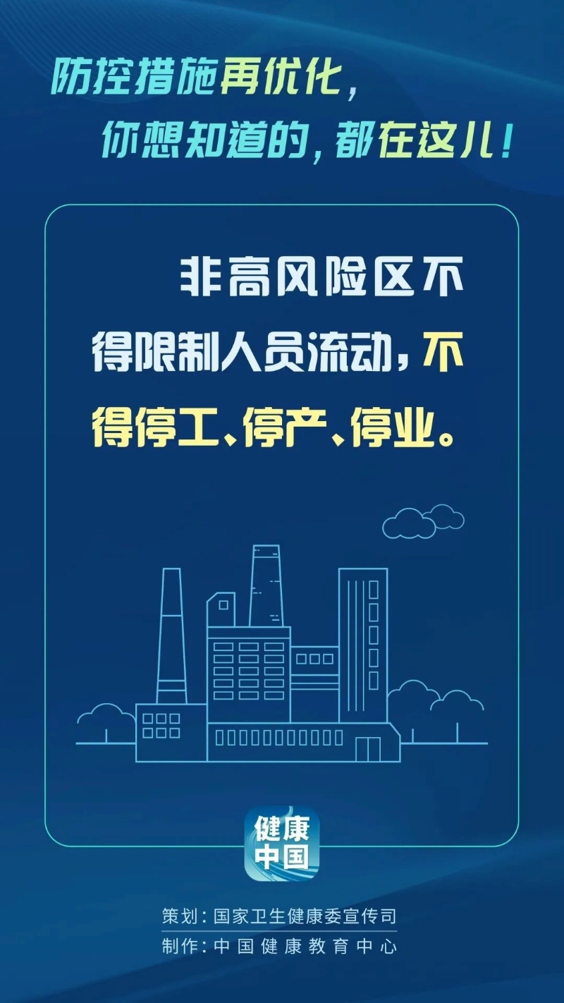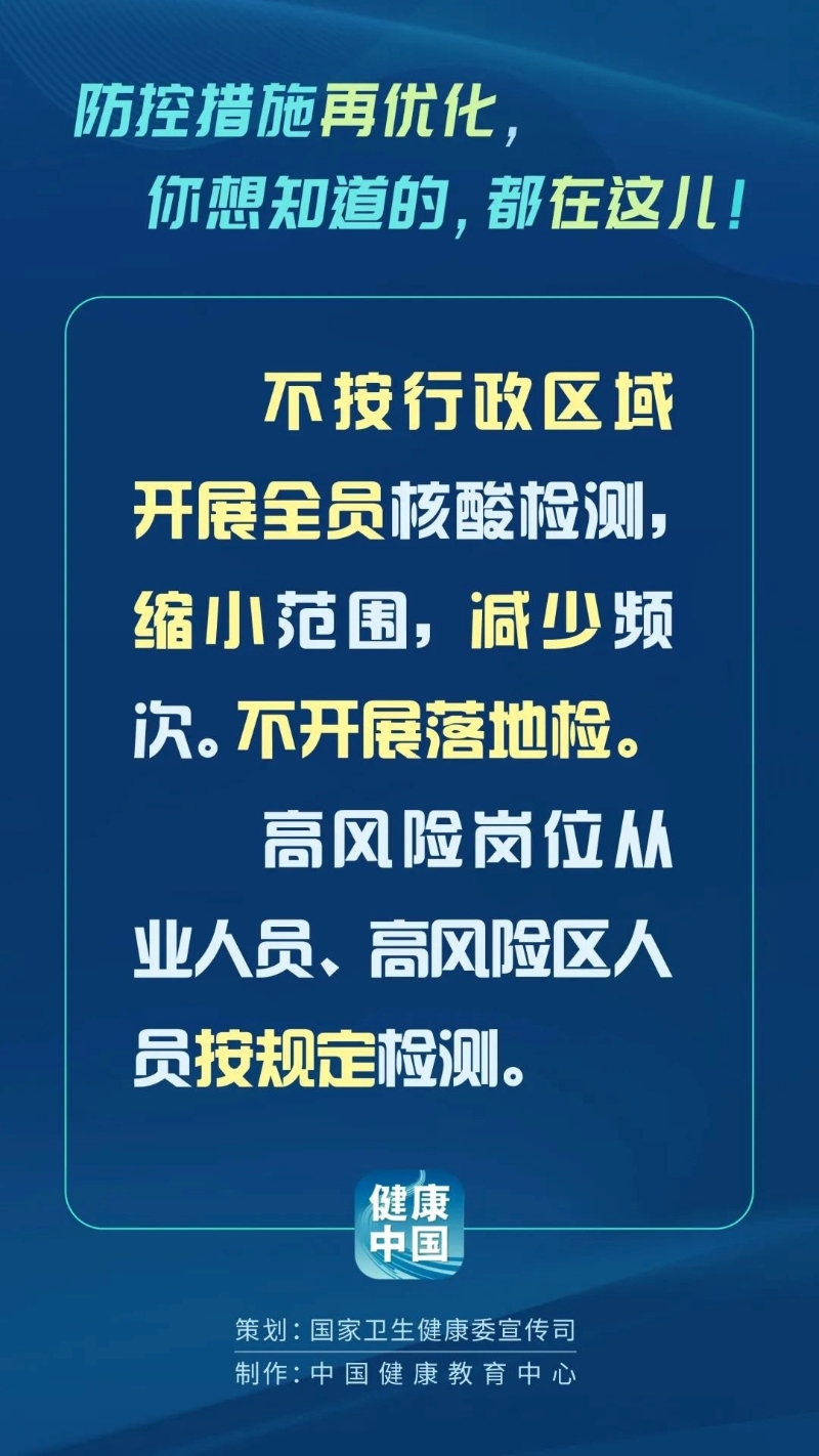 香港新聞網12月7日電 根據中國國家衛健委網站12月7日消息,國務院應對新型冠狀病毒肺炎疫情聯防聯控機制綜合組當日發布關於進一步優化落實新冠肺炎疫情防控措施的通知。 措施包括科學精準劃分風險區域,按樓棟、單元、樓層、住戶劃定高風險區,不得隨意擴大到小區、社區和街道(鄉鎮)等區域,不得採取各種形式的臨時封控;進一步優化核酸檢測,不按行政區域開展全員核酸檢測,進一步縮小核酸檢測範圍、減少頻次;優化調整隔離方式,具備居家隔離條件的無症狀感染者和輕型病例一般採取居家隔離,也可自願選擇集中隔離收治;落實高風險區“快封快解”,連續五天沒有新增感染者的高風險區要及時解封等。