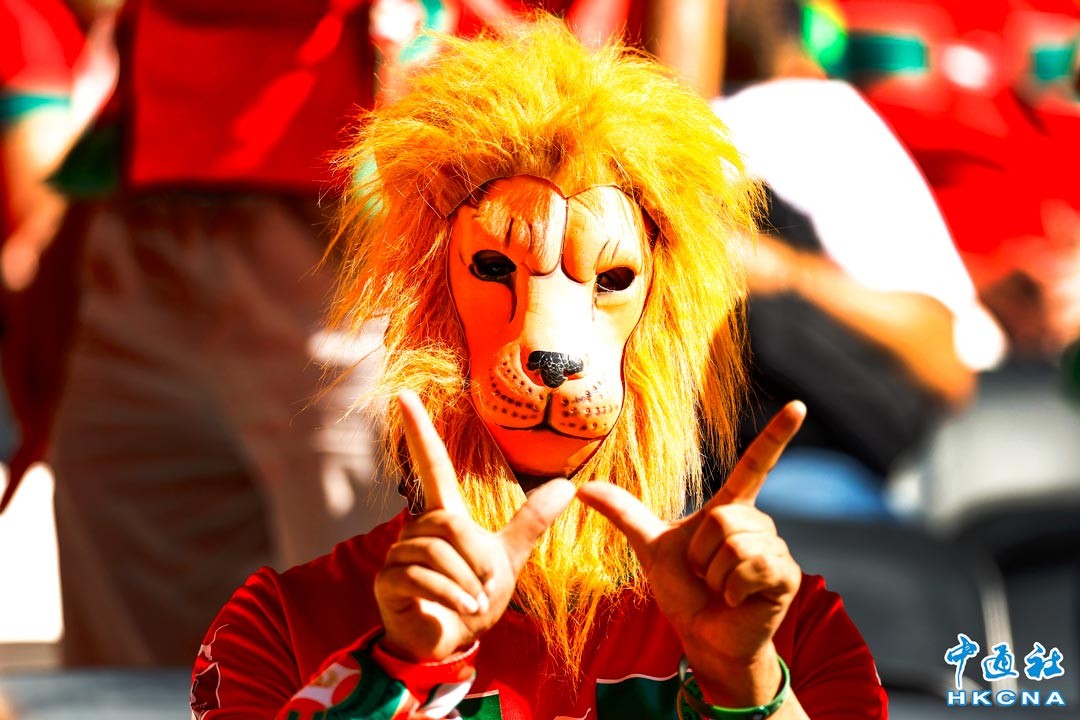 佩戴獅子面具的摩洛哥球迷,摩洛哥隊的暱稱為“阿特拉斯雄獅”。一直不被看好的摩洛哥隊,在淘汰賽中和西班牙120分鐘戰成0:0,最終點球決勝負,3:0爆冷氣走西班牙,歷史性殺入8強,成為卡塔爾世界盃的最強黑馬。