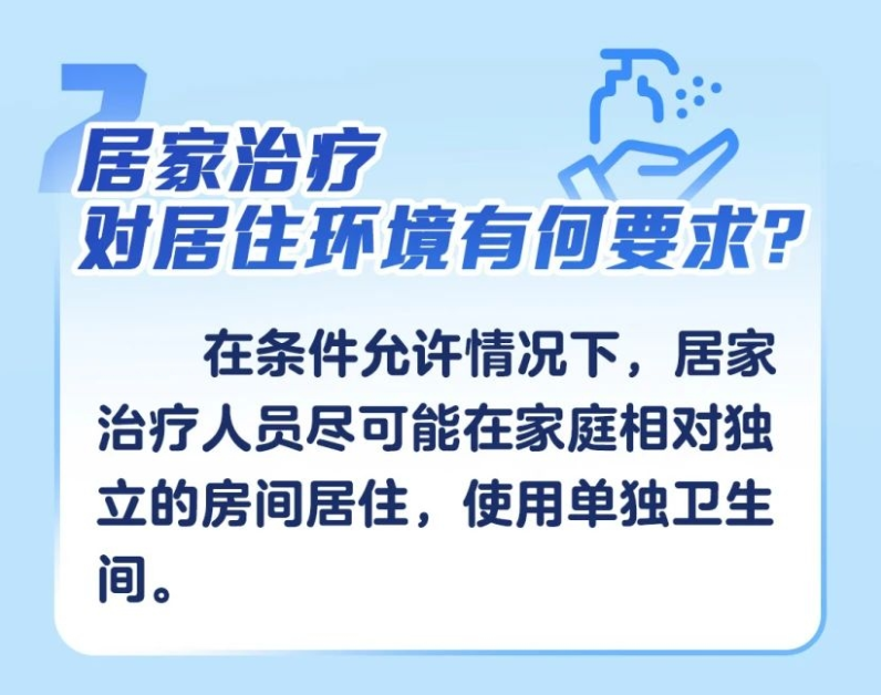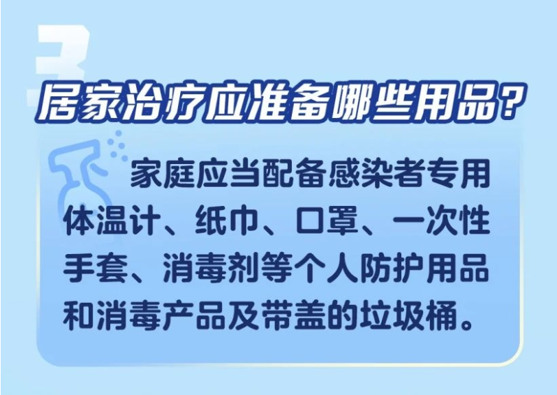 製圖:新華網 指南明確,在條件允許情況下,居家治療人員盡可能在家庭相對獨立的房間居住,使用單獨衛生間。家庭應當配備體溫計(感染者專用)、紙巾、口罩、一次性手套、消毒劑等個人防護用品和消毒產品及帶蓋的垃圾桶。