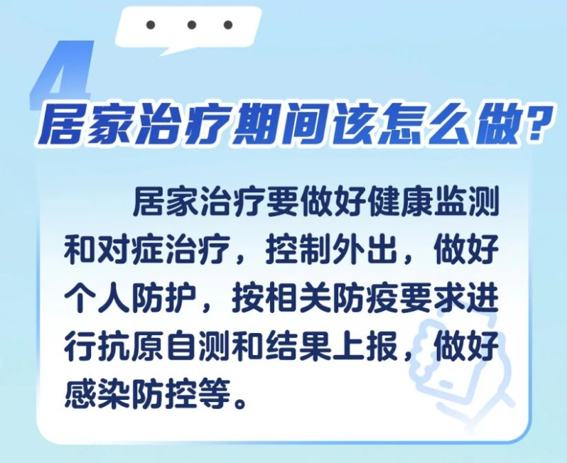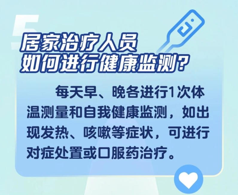 製圖:新華網 針對居家治療人員自我管理要求,指南指出,居家治療人員應當每天早、晚各進行1次體溫測量和自我健康監測,如出現發熱、咳嗽等症狀,可進行對症處置或口服藥治療。如出現呼吸困難或氣促;經藥物治療後體溫仍持續高於38.5℃,超過3天;原有基礎疾病明顯加重且不能控制等情況,可通過自駕車、120救護車等方式,轉至相關醫院進行治療。