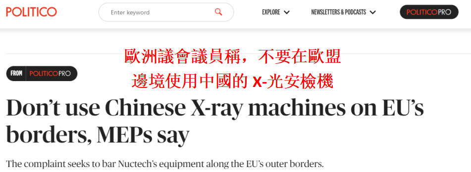 美國《政治》網站報道截圖 文章稱,部分歐洲議會議員日前致信歐盟委員會,警告不要接受中國企業“同方威視”關於進口海關監管設備(X光安檢機)的投標。 同方威視是中國一家著名的安檢設備製造商(包括X光機、掃描儀和爆炸物探測系統等),該公司為全球170多個國家與地區提供服務,在歐盟27國中,有26國已經安裝了該公司的設備。 這些議員在信中警告,任何與該公司進行掃描設備的交易,都會危及歐盟的“國家安全”,并可能使貨物和旅客的信息“落入中國政府之手”。