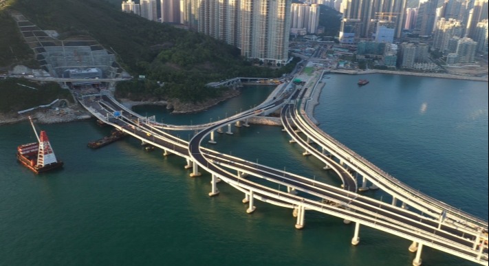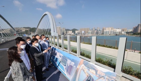 政府新聞網圖片。 跨灣連接路全長約1.8公里,其中約1公里為海上高架橋,連接將藍隧道與日出康城旁的環保大道。跨灣連接路是香港首條同時具備行車道、單車徑及行人路的海上高架橋。除了可分流環保大道的車輛,海上高架橋將與將軍澳海濱單車徑連接,組成全長5公里的沿海環迴單車徑,橋上亦設有觀景台,可供市民欣賞將軍澳灣及東邊水道的美景。 另外,今日起,五條行經將軍澳—藍田隧道的新專營巴士路線將於星期一至五(公眾假期除外)上午及下午繁忙時段提供服務,包括:九巴第96號線(康盛花園—大埔工業邨);九巴第290E號線(將軍澳工業邨—荃灣西站);九巴第298X號線(坑口(北)—長沙灣(甘泉街));新巴第790號線(清水灣半島—尖沙咀東(麼地道));及新巴第795號線(將軍澳工業邨—海達邨(深旺道))。位於藍田交匯處及環澳路的巴士站亦於同日啓用。 【編輯:孟宜君】