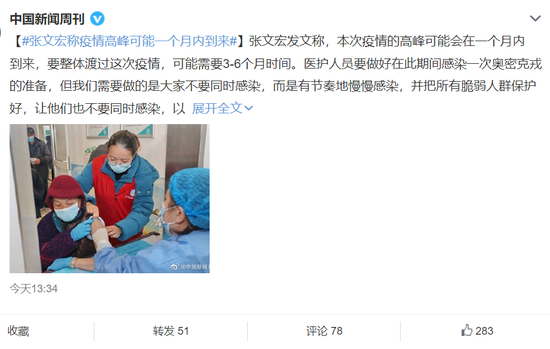 香港新聞網12月12日電 中國國家傳染病醫學中心主任,新冠疫情上海醫療救治專家組組長張文宏醫生發文稱,本次疫情的高峰可能會在一個月內到來,要整體渡過這次疫情,可能需要3-6個月時間。醫護人員要做好在此期間感染一次奧密克戎的準備,但我們需要做的是大家不要同時感染,而是有節奏地慢慢感染,并把所有脆弱人群保護好,讓他們也不要同時感染,以防止我們的醫療資源出現巨大的擠兌。