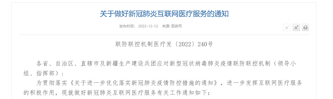 《通知》指出,要進一步發揮互聯網醫療的積極作用,醫療機構可以通過互聯網診療平台,對出現新冠肺炎相關症狀的患者、符合居家條件的,在線開具治療新冠肺炎相關症狀的處方,并鼓勵委託符合條件的第三方將藥品配送到患者家中。 鼓勵醫療機構提供24小時網上咨詢服務,為兒童、孕產婦、老年人等患者提供就醫及心理咨詢、用藥指導等服務,同時積極開展分時段精準預約,縮短患者到院後等待時間。 以下是《通知》原文: 關於做好新冠肺炎互聯網醫療服務的通知 各省、自治區、直轄市及新疆生產建設兵團應對新型冠狀病毒肺炎疫情聯防聯控機制(領導小組、指揮部): 為貫徹落實《關於進一步優化落實新冠肺炎疫情防控措施的通知》,進一步發揮互聯網醫療服務的積極作用,現就做好新冠肺炎互聯網醫療服務有關工作通知如下: 一、醫療機構(包括互聯網醫院、開展互聯網診療服務的醫療機構)可以通過互聯網診療平台,依據最新版新型冠狀病毒肺炎診療方案有關要求,為出現新冠肺炎相關症狀的患者、符合《新冠病毒感染者居家治療指南》居家的,在線開具治療新冠肺炎相關症狀的處方,并鼓勵委託符合條件的第三方將藥品配送到患者家中。 二、醫療機構開展互聯網診療服務過程中,若發現患者病情出現變化或存在其他不適宜在線診療服務的,醫師應當引導患者到實體醫療機構就診。 三、為方便人民群眾獲得健康咨詢、就醫指導、預約診療等服務,降低交叉感染風險,鼓勵醫療機構提供24小時網上咨詢服務,為兒童、孕產婦、老年人、透析患者和合併基礎疾病的患者提供就醫及心理咨詢、用藥指導等服務,同時積極開展分時段精準預約,縮短患者到院後等待時間。 四、鼓勵醫聯體內上級醫院通過遠程會診、遠程診斷、遠程培訓等方式提高基層醫療機構對高風險人群的識別、診斷和處置能力。 五、縣級及以上地方衛生健康行政部門應當加強對互聯網診療服務的監管,醫療機構應當落實互聯網診療服務的醫療質量安全責任,確保線上線下醫療服務一體化、醫療質量安全同質化。 國務院應對新型冠狀病毒肺炎疫情 聯防聯控機制醫療救治組 2022年12月11日(完) 【編輯:錢林霞】