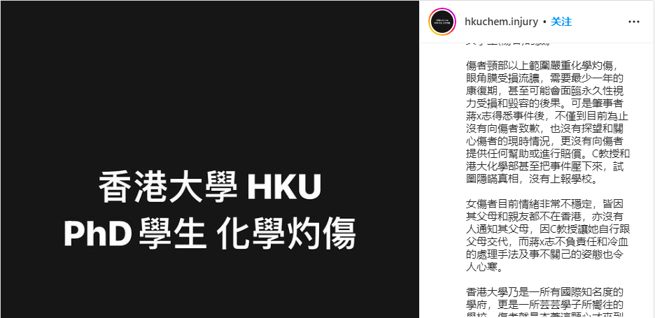 帖文稱,傷者頸部以上範圍嚴重化學灼傷,眼角膜受損流膿,需要最少一年的康復期,甚至可能會面臨永久性視力受損和毀容的後果。而涉事者沒有向傷者提供任何幫助或進行賠償。港大化學部甚至把事件壓下來,試圖隱瞞真相,沒有上報學校。 該網友形容,女傷者目前情緒非常不穩定,皆因其父母和親友都不在香港。“希望港大能嚴肅跟進和處理事件,讓女傷者得到公平,以及應有的照顧和賠償。” 13日,“香港大學學生會校園電視”臉書專頁發帖文稱,就此事向香港大學傳訊及公共事務處查詢,港大發言人回覆稱,港大理學院對12月6日有博士生於實驗室被化學物料濺傷一事高度重視,指社交媒體貼文中有不少失實之處,認為有需要加以說明。