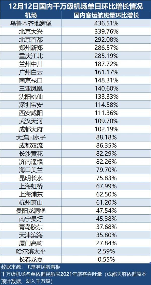 隨著國家聯防聯控機制發佈《關於進一步優化落實新冠肺炎疫情防控措施的通知》(以下簡稱“新十條”),民航市場進入高速復甦的快車道,加上13日0時“通信行程卡”服務將正式下線,整體出行意願倍增,除了即刻出行的訂單,春運機票預訂量也大幅增加。據去哪兒數據顯示,自12月7日以來,春運期間即2023年1月7日至1月21日機票預訂量大幅增長,環比一周前增長近8.5倍,熱門目的地排名前十為哈爾濱、三亞、成都、海口、上海、長春、深圳、瀋陽、北京、昆明等城市,此前,春運火車票預約量同樣增長明顯。 12月12日,據第三方民航數據app“飛常準”民航看板數據顯示,12日當天國內吞吐量千萬級機場客運航班量環比上周同期均呈增長態勢,其中14家千萬級機場漲幅超過100%。具體來看,依次是烏魯木齊地窩堡機場、北京大興機場、北京首都機場、鄭州新鄭機場、重慶江北機場、蘭州中川機場、廣州白雲機場、南京祿口機場、三亞鳳凰機場、瀋陽桃仙機場、深圳寶安機場、西安鹹陽機場、武漢天河機場、成都天府機場。烏魯木齊地窩堡機場漲幅最明顯,單日環比上周同期增長436.51%。