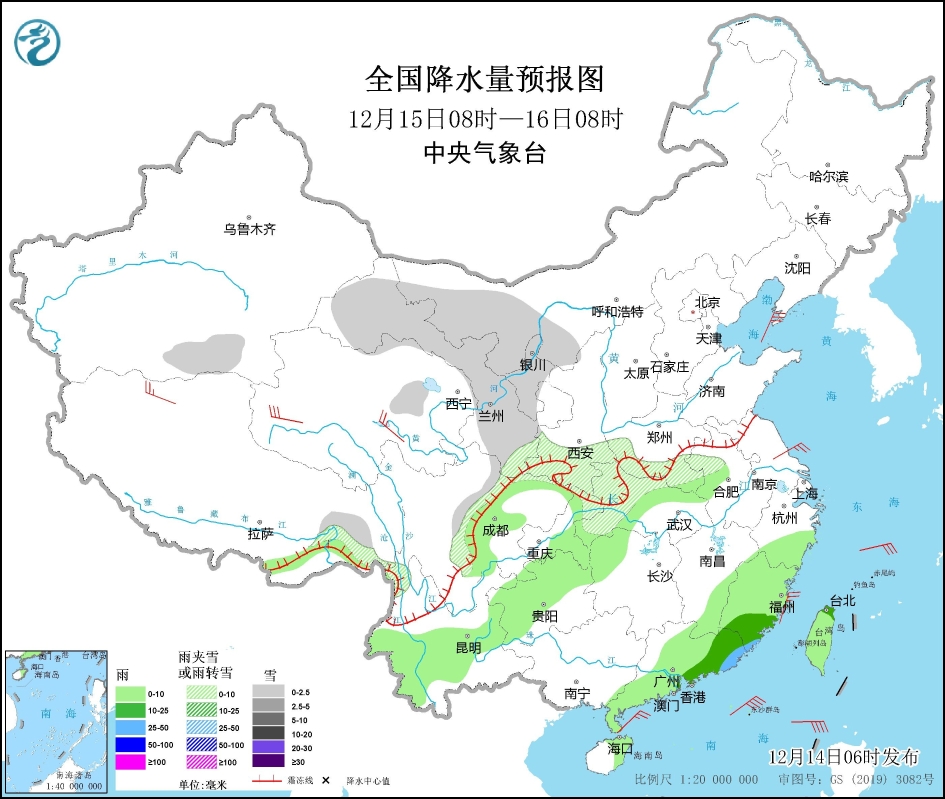 全國降水量預報圖 圖源:中央氣象台 18日前後,最低氣溫0℃線將南壓至廣西北部、廣東中北部一帶,昆明、福州、廣州最低氣溫可能刷新今年下半年來新低。明後天降水有所增多,隨著氣溫逐漸轉低,河南、湖北、安徽、江蘇等部分地區可能會有雪花飄落。 明天(15日),內蒙古西部、甘肅大部、寧夏、陝西北部、河南南部、湖北西部和北部等地部分地區有小雪或雨夾雪。江南中東部和南部、西南地區東部和南部、華南中北部和南部、台灣島等地部分地區有小到中雨,其中,福建東南部、廣東東南部等地部分地區有大雨。 當地公眾氣象專家提醒公眾做好防寒保暖,需注意防範雨雪天氣道路濕滑對出行的不利影響,大風天氣外出,需遠離廣告牌和戶外臨時搭建物等危險區域。(完) 【編輯:王軼南】