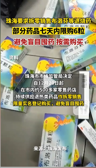 珠海退燒藥拆零銷售 圖源:網絡 北京、珠海退燒藥拆零銷售 北京市藥監局副局長王厚廷19日下午表示,適用於重症患者的用藥優先配送至大型三級甲等綜合醫院和相應專科醫院,適用於兒童的劑型優先配送至設有兒科門診的醫療機構,對於投放至藥店的大包裝退燒藥嚴格要求按需拆零銷售。 王厚廷還表示,北京市醫藥物資保障專班組織企業正加快全球採購,組織電商平台通過跨境電商銷售醫藥產品的方式,採購進口藥,緩解國內藥品短缺壓力。經過一段時間來的緊張調度,民眾就醫用藥需求保障整體仍處在緊平衡狀態,但已出現趨穩向好的明顯態勢。 珠海市市場監管局決定自12月20日起,在市內約500多家零售藥店持續供應退熱類藥品作拆零銷售。布洛芬緩釋膠囊、雙氯芬酸鈉緩釋膠囊、洛索洛芬鈉膠囊七天內購買量不超過6粒,布洛芬混懸液七天內購買量不超過1瓶。上述品種七天內只能選購其中一種,零售價均為人民幣1元/粒,布洛芬混懸液(100毫升裝)銷售價為19元/瓶。市民在指定藥店憑身份證線下購買,購買時需登記身份信息,以便查詢。 據南京發佈消息,為緩解近期購買退熱藥難的問題,19日起,南京市每日持續向市場投放退燒藥200萬片。12月19日起,153家零售藥店統一拆零銷售,每個顧客限6粒,憑身份證購買,可刷醫保。 多省市聘退休醫護迎戰疫峰 隨著內地疫情第一波高峰陸續來臨,醫務人員感染的情況正在全國範圍內發生。北京市一位三甲醫院醫師,其所在科室已經全員感染,醫院目前不要求檢測核酸或者抗原,只要症狀減輕,醫務人員就會盡快返崗。面對疫情衝擊下醫務人員緊缺局面,廣東廣州、山東萊州、福建福州、安徽蚌埠等多地動員或返聘退休醫務工作者,重新投入醫療救治一線。