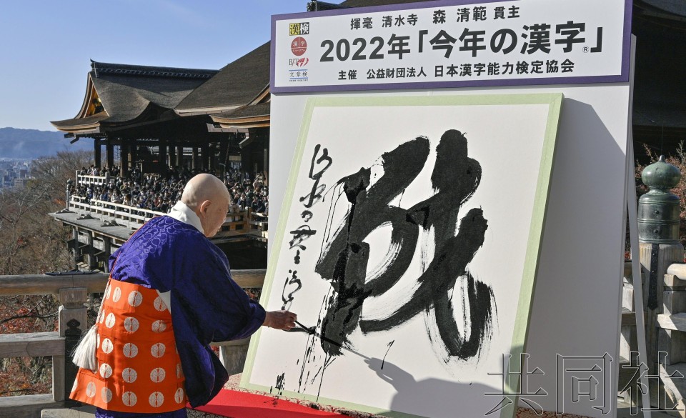 12月12日下午在京都清水寺,住持森清範揮毫寫下2022年年度漢字“戰”。圖源:共同社 日本漢字能力檢定協會12日宣佈,最能反映2022年世態民情的年度漢字是“戰”。當選理由包括俄烏衝突、新冠疫情和通貨膨脹等。在京都市東山區的清水寺,住持森清範在高1.5米、寬1.3米的和紙上,用特大毛筆揮毫寫下“戰”字,並將在寺中陳列一年。 韓國:“過而不改”