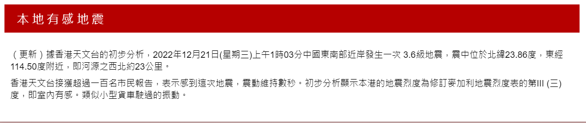 香港新聞網12月21日電 中國廣東河源市東源縣今日(21日)凌晨發生黎克特制3.6級地震,深度為8公里。香港天文台表示,接獲超過100名市民報告,表示感到這次地震,震動維持數秒。