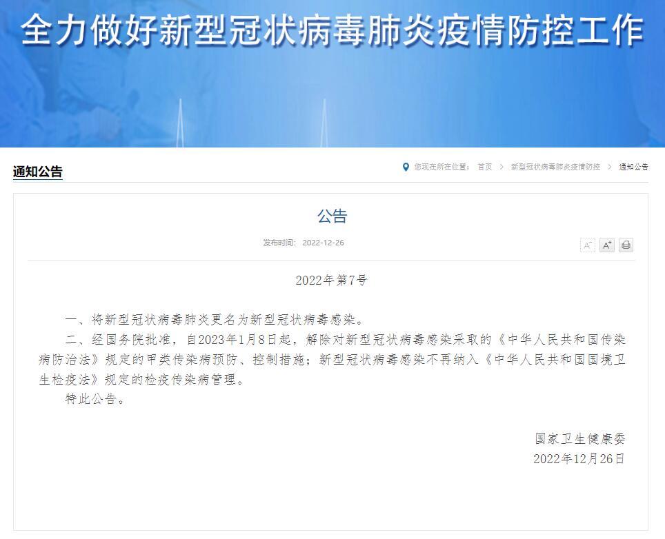 國家衛健委:將新冠肺炎更名為新型冠狀病毒感染,1月8日起實施“乙類乙管”香港新聞網12月27日電 12月26日晚間,國家衛生健康委網站發布公告: 一、將新型冠狀病毒肺炎更名為新型冠狀病毒感染。 二、經國務院批準,自2023年1月8日起,解除對新型冠狀病毒感染採取的《中華人民共和國傳染病防治法》規定的甲類傳染病預防、控制措施;新型冠狀病毒感染不再納入《中華人民共和國國境衛生檢疫法》規定的檢疫傳染病管理。