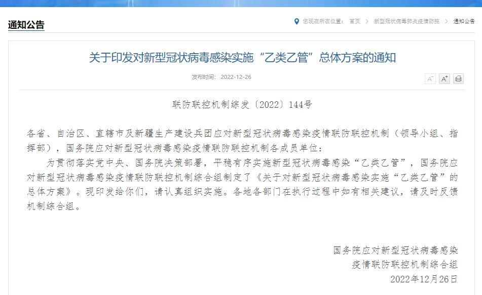 關於印發對新型冠狀病毒感染實施“乙類乙管”總體方案的通知 聯防聯控機制綜發〔2022〕144號 各省、自治區、直轄市及新疆生產建設兵團應對新型冠狀病毒感染疫情聯防聯控機制(領導小組、指揮部),國務院應對新型冠狀病毒感染疫情聯防聯控機制各成員單位: 為貫徹落實黨中央、國務院決策部署,平穩有序實施新型冠狀病毒感染“乙類乙管”,國務院應對新型冠狀病毒感染疫情聯防聯控機制綜合組制定了《關於對新型冠狀病毒感染實施“乙類乙管”的總體方案》。現印發給你們,請認真組織實施。各地各部門在執行過程中如有相關建議,請及時反饋機制綜合組。 國務院應對新型冠狀病毒感染 疫情聯防聯控機制綜合組 2022年12月26日 (信息公開形式:主動公開)
