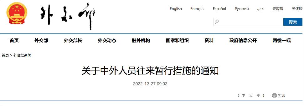 香港新聞網12月27日電 中國外交部網站12月27日,其發佈《關於中外人員往來暫行措施的通知》。