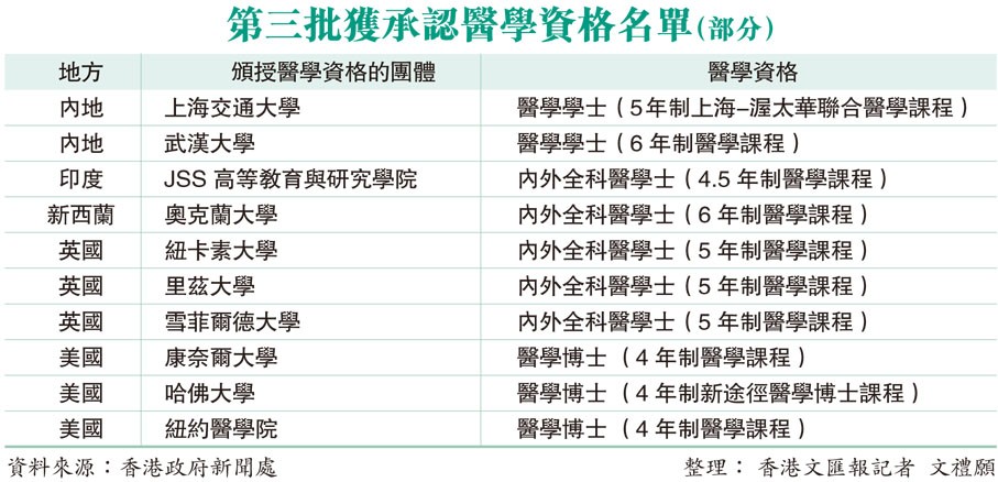 第三批獲承認醫學資格名單(部分) 製圖:香港文匯報 畢業於今批25間大學的醫科生能豁免“執業試”來港執業,不過據醫學界了解,過去一年透過這渠道獲執業資格的醫生約20人,原因是申請門檻過高,既要求申請者是名單上認可課程的畢業生,又要取得專科資歷,以及必須為香港永久居民。