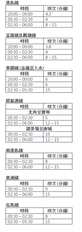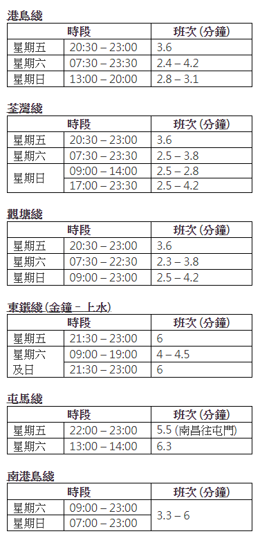 港島綫、荃灣綫、觀塘綫及東鐵綫於除夕夜加強服務。