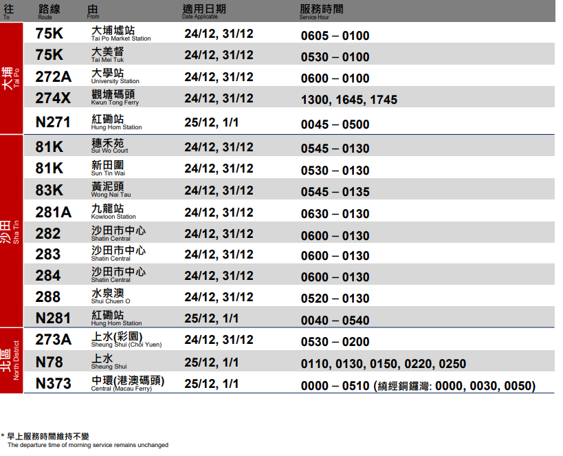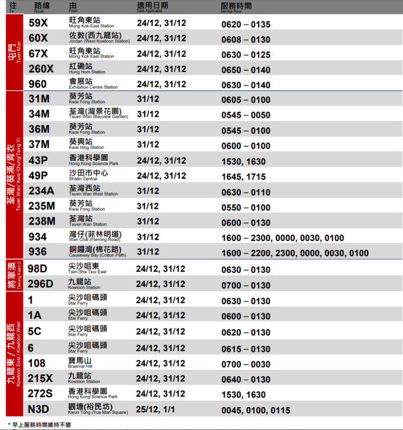 港鐵加強多條鐵路綫逢星期五晚間非繁忙時段及周末的列車服務。 九巴加強41條巴士路線服務 為方便市民於聖誕及除夕出行,九巴將於除夕(12月31日)加強共41條巴士路線服務,包括調整服務時間及加密班次。