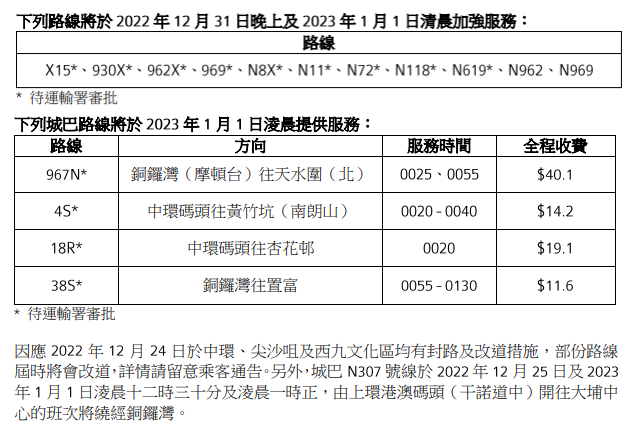 九巴加強多條路線服務。 城巴新巴增設特別通宵路線 城巴新巴會在新年增設特別通宵路線及加強部分路線服務,包括969、N962、N969等路線。另外,城巴N307號線於2023年1月1日凌晨12時30分及凌晨1時正,由上環港澳碼頭(干諾道中)開往大埔中心的班次將繞經銅鑼灣。
