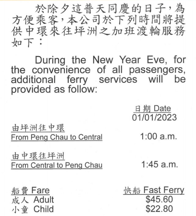 城巴新巴增設特別通宵路線。 天星小輪延長服務 天星小輪將會於除夕夜延長服務時間,來烏尖沙咀至中環及尖沙咀至灣仔兩條航綫,最後開出時間為元旦日凌晨1時。 港九小輪延長服務 港九小輪宣布,為方便乘客慶祝,當晚中環來往坪洲的航綫會延長服務時間,當中由坪洲出發的尾班船會於1月1日凌晨1時開出,至於中環出發則於同日凌晨1時45分開出。(完)