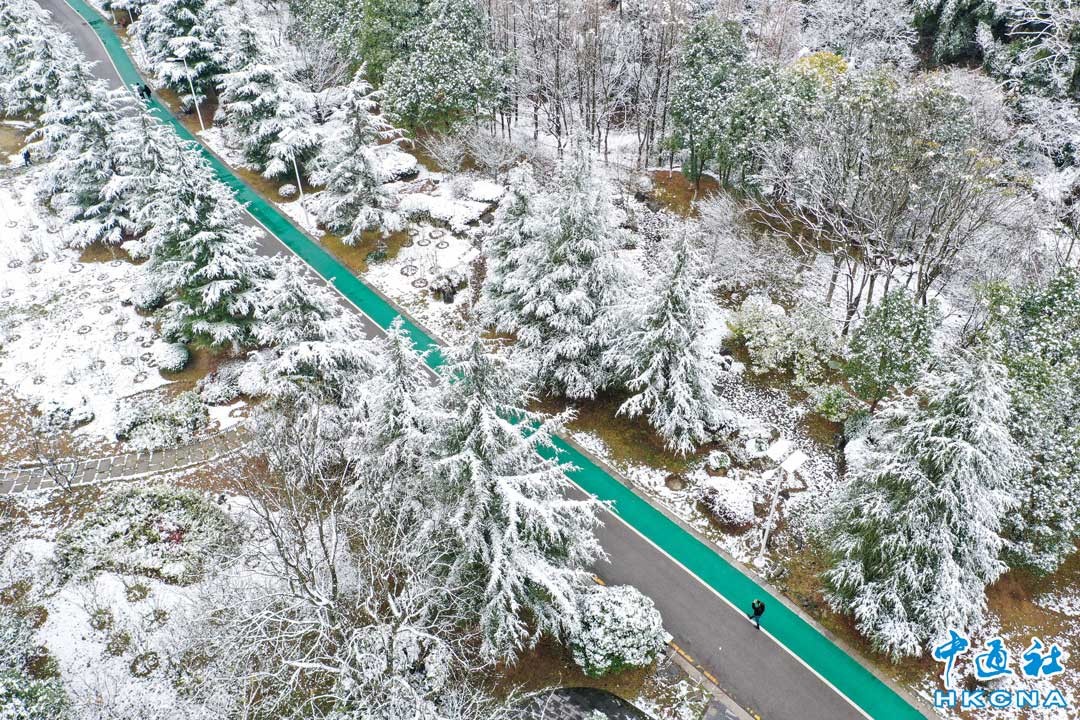 12月28日,貴陽市區出現降溫降雪天氣,空中俯瞰貴陽觀山湖公園,雪後景色美如畫。 香港中通社圖片