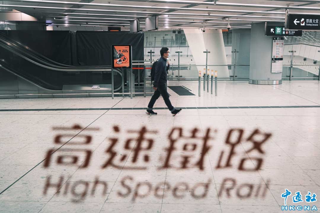 12月29日傍晚,香港西九龍高鐵站內燈火通明,有職員於高鐵站內值班。隨著香港與內地通關在即,目前,港鐵正密鑼緊鼓為通關做好準備,全力配合政府,並與相關部門緊密聯繫,制定方案以確保鐵路服務逐步、有序、全面連繫兩地。(香港中通社記者 許其皓攝)