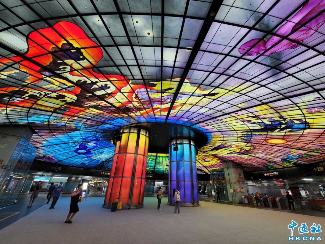 台灣高雄捷運“美麗島站”站體為日本建築師“高松伸”所設計,四個扇形建築所表達的意象為“合掌”與”祈禱”,外型宛若一座教堂,訴求讓人沉思與反省。美麗島站最大的特色在於中央穿堂層圓型穹頂處,由義大利裔美籍藝術家水仙大師(Maestro Narcissus Quagliata)所繪製設計的“光之穹頂”,在這巨大彩繪玻璃圓頂,繪製了象徵高雄的海洋與生命間的互動,目前是全球最大單件玻璃公共藝術作品。圖為高雄捷運“美麗島站”“光之穹頂”彩繪玻璃圓頂。 香港中通社圖片