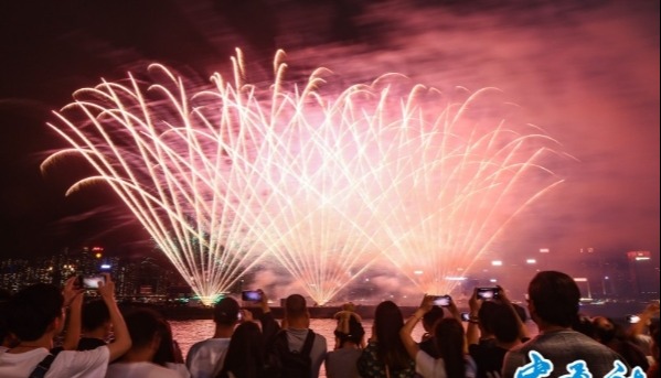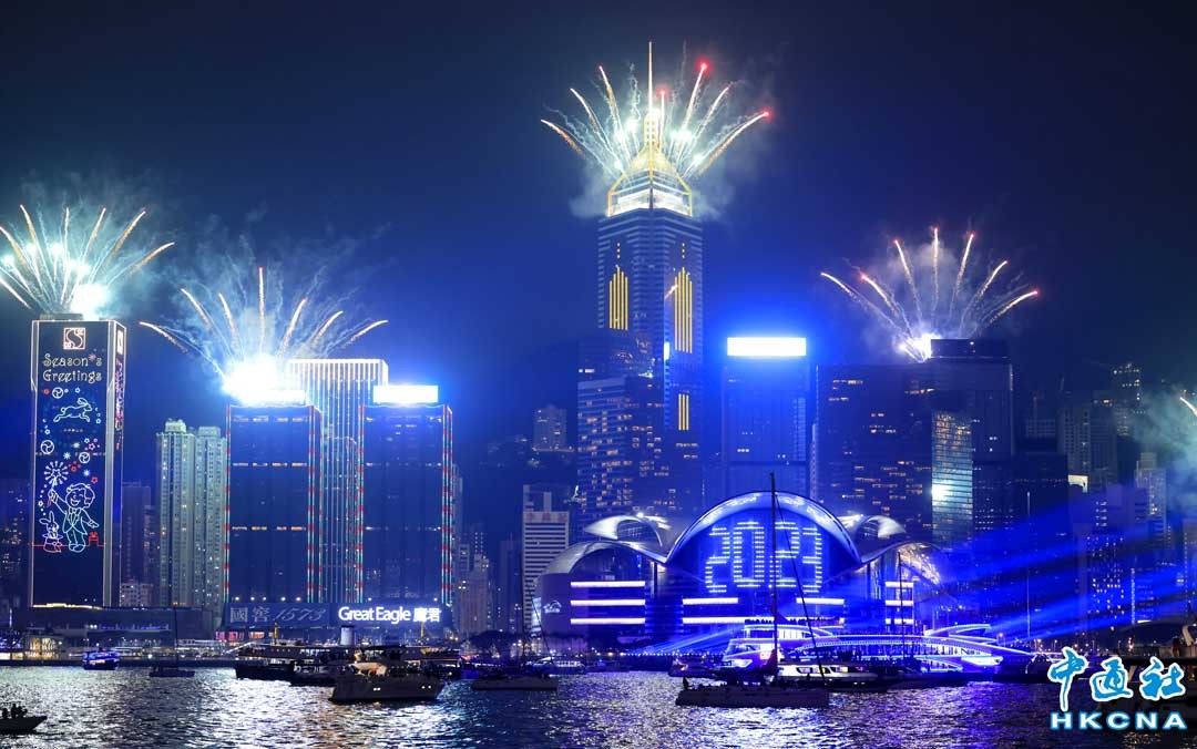 2023年1月1日0時,香港維多利亞港的壯麗夜空化作巨型畫布,於兩岸上演“幻彩詠香江”加強版煙火匯演。香港會展中心外牆顯示 “2023”字樣及祝福語,多幢香港島主要大廈施放璀璨奪目的迷人煙火,配以不計其數的探射燈、激光、LED屏幕圖案和燈光效果,點亮維港兩岸,迎接2023年的到來。(香港中通社記者 許其皓攝)