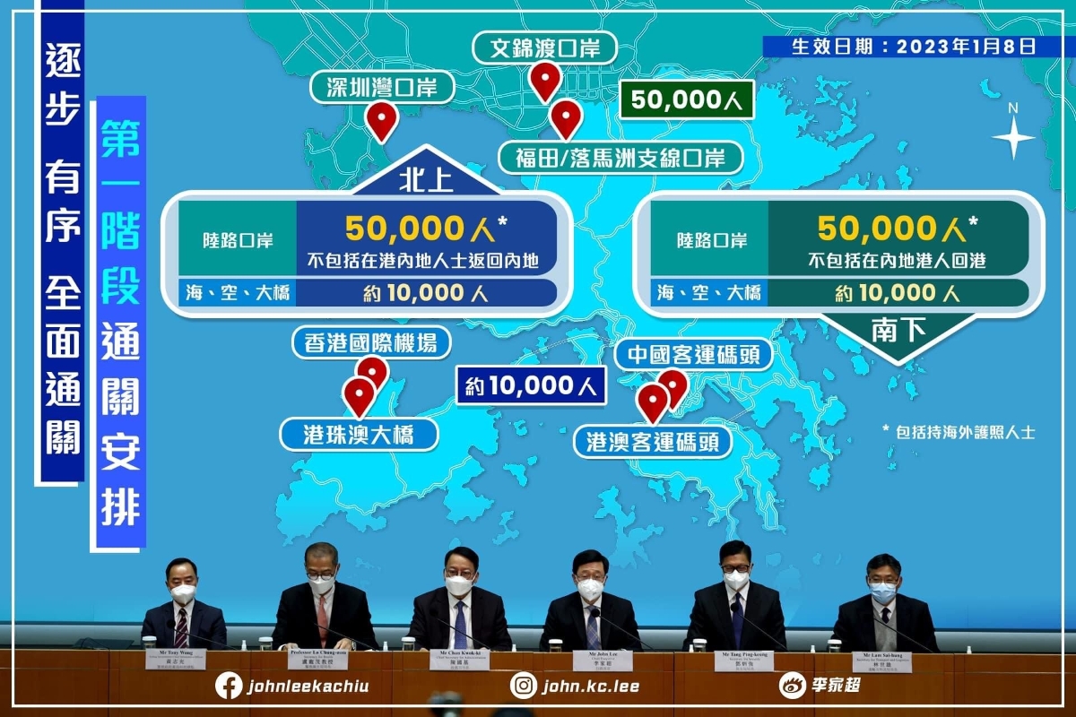 香港新聞網1月5日電 香港特區政府5日宣布,1月8日起香港與內地分階段有序恢復兩地人員正常往來,以逐步、有序、全面實施通關。 通關第一階段將開放機場、港珠澳大橋、港澳客輪碼頭和中國客運碼頭,以及三個陸路口岸:深圳灣口岸、福田口岸、文錦渡口岸,南下及北上各設6萬個名額。其中陸路口岸佔據5萬個名額,必須預約;不過,北上前往內地的內地居民、南下前往香港的香港居民和經香港北上後返港的外地旅客不用預約。