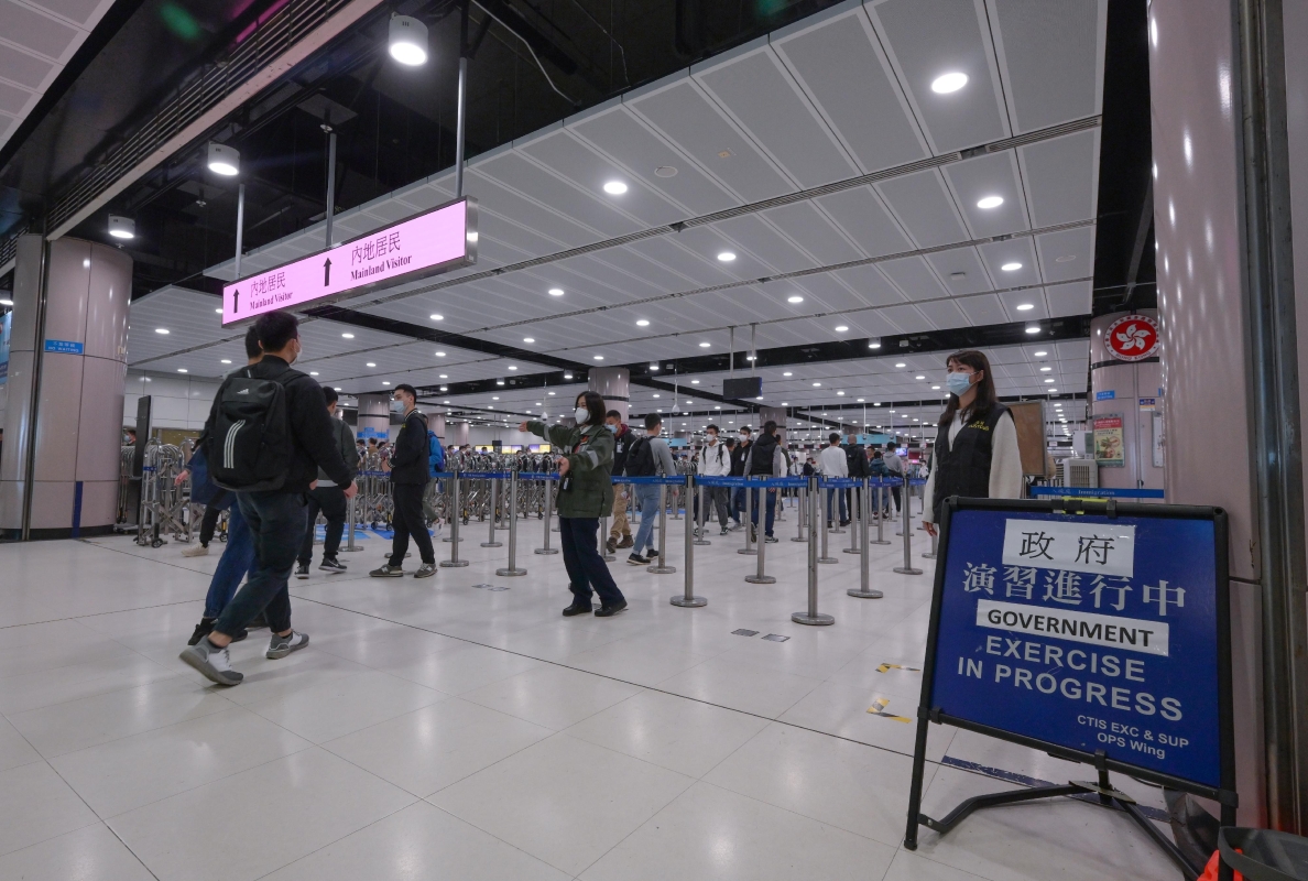 入境事務處人員與模擬旅客於深圳灣管制站進行演練。