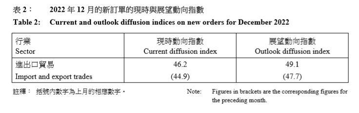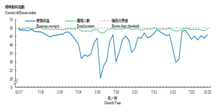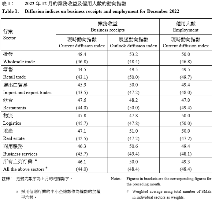 图源:香港政府统计处 中小企業務收益的現時動向指數從2022年11月在收縮區域的44.0上昇至2022年12月的46.1,而未來一個月(即2023年1月)的業務收益展望動向指數為50.0。按行業分析,所有統計調查涵蓋的行業的業務收益現時動向指數在2022年12月均較上月上昇,特別是地產業(從42.5上昇至47.1)及飲食業(從44.0上昇至47.6)。