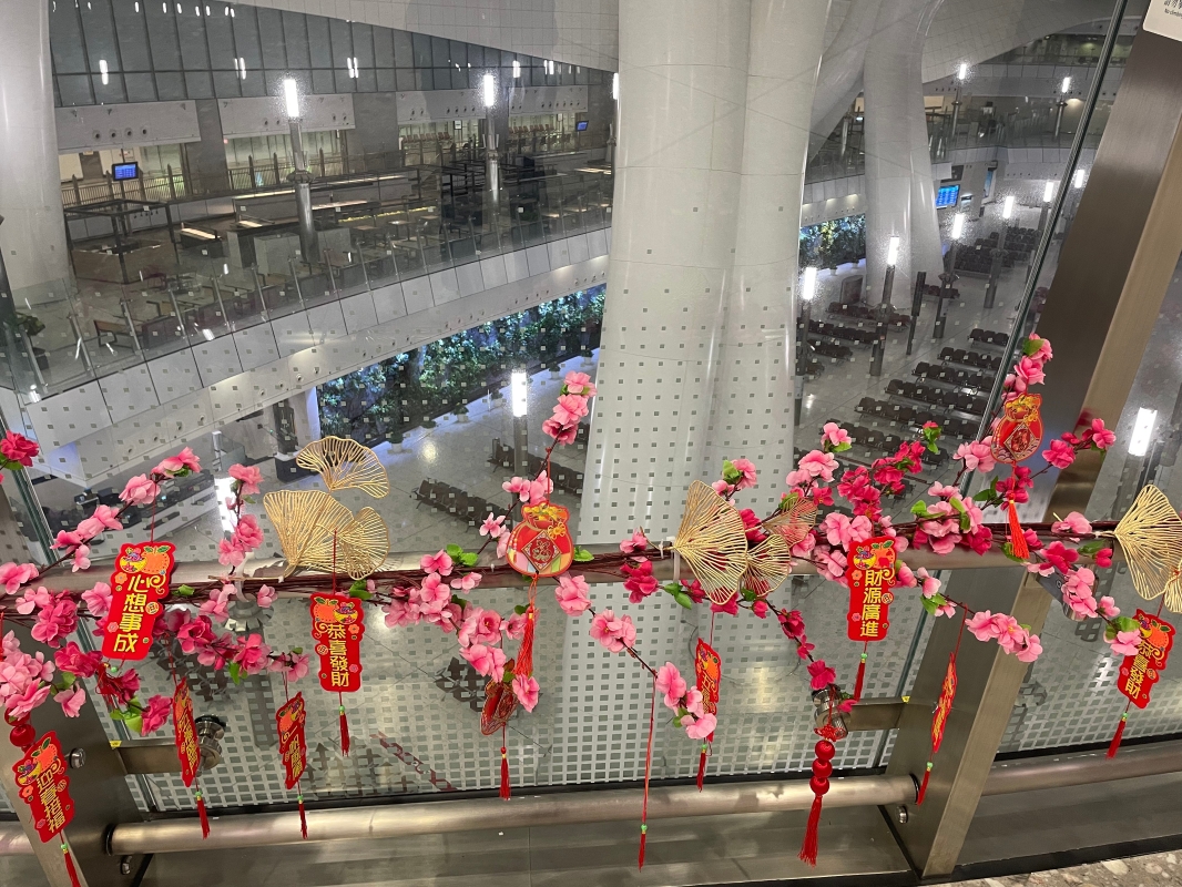 香港新聞網1月15日電 (記者 李明珠)經歷近三年的暫停運營後,廣深港高鐵香港段1月15日重新迎接北上南下旅客。 記者現場所見,香港西九龍高鐵站內煥然一新,新增多個指示牌,寫有離港短途列車信息的電子屏也重新亮起,重啟首日不少車次車票售罄。售票大堂周圍的欄杆上也裝上桃花等新春裝飾。早上五時半,已有不少出行的市民,帶著大件行李等待高鐵站開門。
