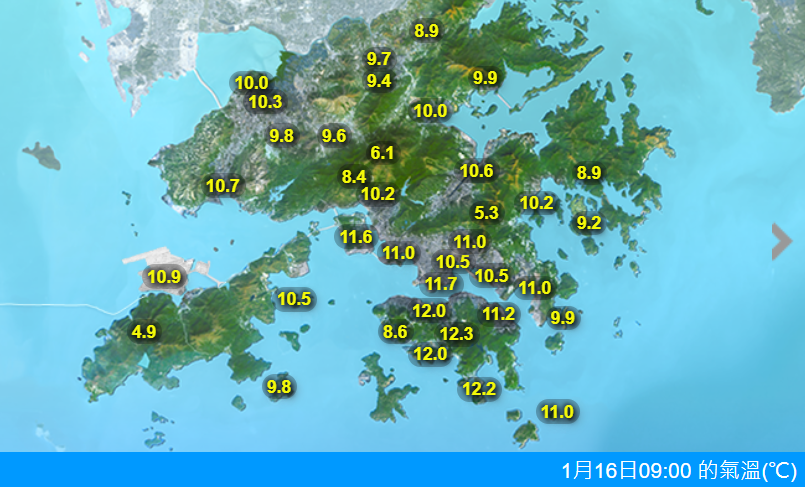 香港新聞網1月16日電 香港天文台表示,一股達強風程度的冬季季候風正影響廣東,香港今早天氣寒冷,大部分地區氣溫降至11度或以下,較昨日低8至10度左右。