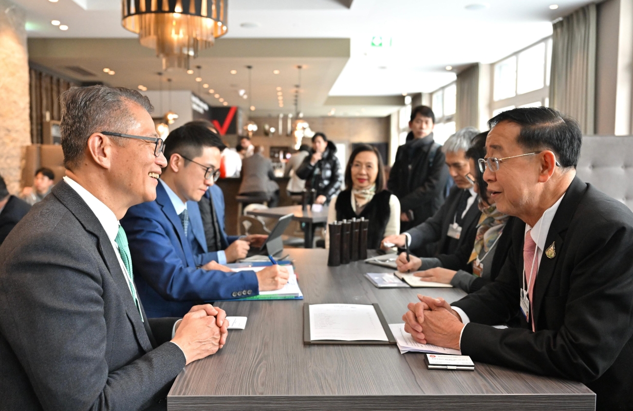 香港新聞網1月17日電 財政司司長陳茂波昨日(達沃斯時間16日)在瑞士達沃斯與多名出席世界經濟論壇年會的政商界領袖會面,向他們介紹香港復常的最新情況和發展機遇。年會於昨日開幕。 在昨日行程中,陳茂波與泰國財政部長Arkhom Termpittayapaisith會面,雙方就最新的環球經濟和金融形勢交換意見,並探討進一步加強兩地在金融方面的合作。陳茂波指,香港的金融巿場既深且闊,與內地巿場“互聯互通”的渠道不斷擴大和深度發展,同時匯聚了國際和內地資本。陳茂波歡迎泰國企業積極利用香港高效的籌融資平台,為大型基建或其他項目融資。