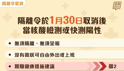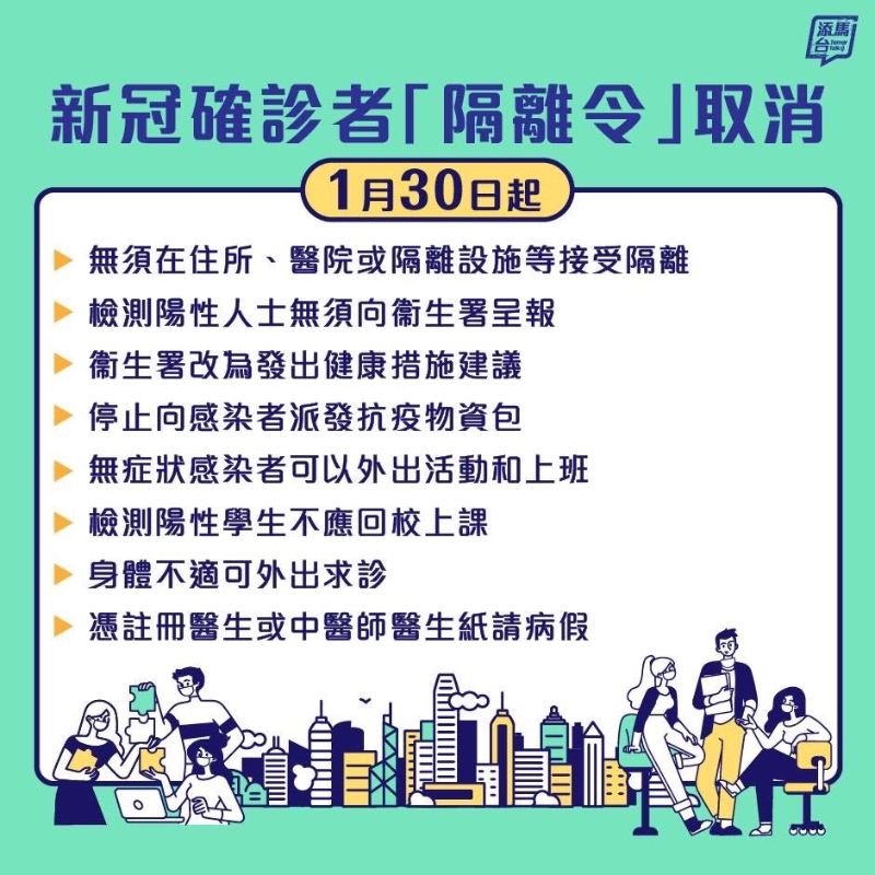 香港新聞網1月20日電 香港特區政府昨日(19日)宣布,由1月30日起撤銷根據《預防及控制疾病規例》(第599A章)向感染人士發出隔離令的安排,即意味著新冠確診者隔離令將會取消,所有檢測陽性人士,包括核酸檢測及快測均無須呈報,亦無須在住所、醫院或隔離設施隔離。至於僱員感染新冠病毒,根據僱傭條例,相關病假安排與其他疾病看齊。