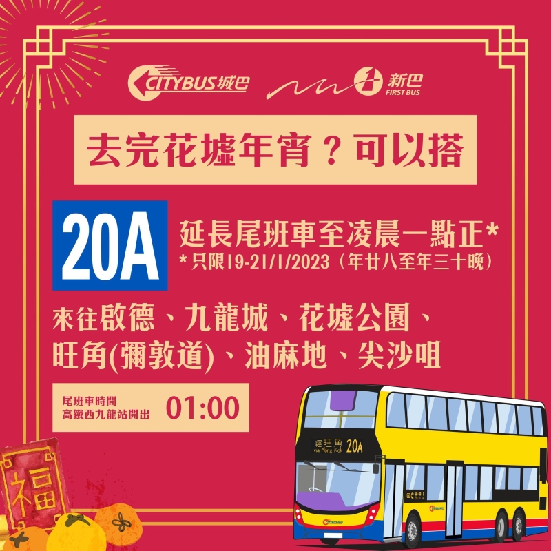 來往花墟公園年宵之選20A 高鐵西九龍站↔啟德 經:尖沙咀、油麻地、旺角(彌敦道)、花墟公園、九龍城、啟晴、德朗 尾班車時間:01:00(同樣適用於年廿八及年廿九晚深夜)
