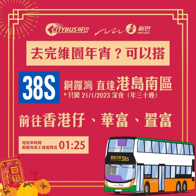 維園年宵之選38S 銅鑼灣(中央圖書館)↔置富 經:香港仔、華富 尾班車時間:01:25