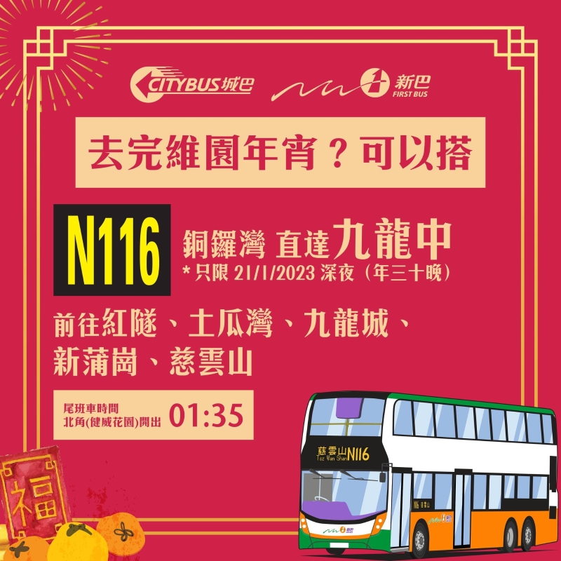 N116 北角(健威花園)↔慈雲山(中) 經:紅隧、土瓜灣、九龍城、新蒲崗 尾班車時間:01:35