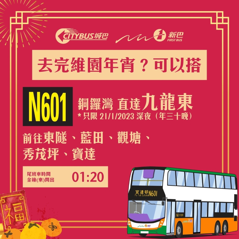 香港新聞網1月20日電 城巴新巴將於年三十(1月21日),增設特別路線及加強服務,包括:20A由高鐵西九龍站往啟德、38S由銅鑼灣中央圖書館往置富、N116由北角健威花園往慈雲山中、N601由金鐘東往寶達,及967N由銅鑼灣摩頓台往天水圍北。而市民亦可乘搭城巴新巴的28條常規通宵路線。