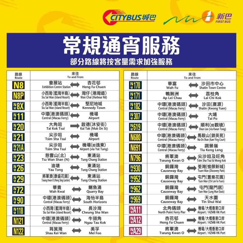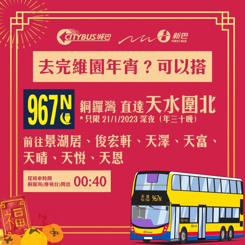 967N 銅鑼灣(摩頓台)↔天水圍北 經:景湖居、俊宏軒、天澤、天富、天晴、天悅、天恩 尾班車時間:00:40 城巴新巴指,因應大除夕當日多區可能有特別交通安排,部分路線將會改道,或有巴士站臨時安排,巴士服務或會因應實際情況作出調整。
