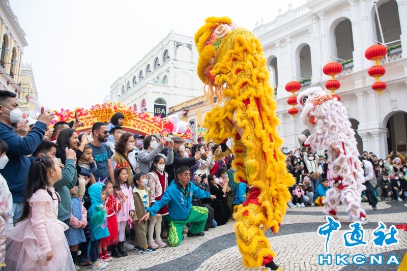 香港中通社澳門1月23日電 (記者 李零壹)238米長的大金龍從澳門大三巴牌坊出發,大年初一和初二在澳門多個地區巡遊表演,伴隨金龍的小獅靈動活潑,財神、福祿壽三星、金童玉女、兔生肖及澳門特區旅遊吉祥物“麥麥”也向遊人拜年及派送金元寶……