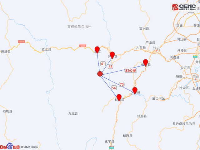 周邊縣城:震中距瀘定縣38公里、距康定市41公里、距石棉縣56公里、距漢源縣70公里、距滎經縣83公里,距甘孜藏族自治州47公里,距成都市229公里。 截至6時,四川消防甘孜支隊前突小組28人6車已到達磨西鎮、燕子溝鎮、德威鎮、冷磧鎮、得妥鎮,組織開展人員搜救和災情排查;雅安支隊前突小組30人5車已到達王崗坪鄉和新民鄉,組織開展人員搜救和災情排查。甘孜、雅安地震救援力量共120人23車3犬正在趕赴震中。雅安支隊6人5艘舟艇已在石棉縣新民鄉待命。根據災情情況,四川消防總隊命令成都、樂山、眉山支隊地震救援隊共270人65車9犬趕赴雅安支隊天全縣大隊前置待命。截至目前,共調派甘孜、雅安、成都、樂山、眉山等5個支隊共454人99車12犬5舟艇。