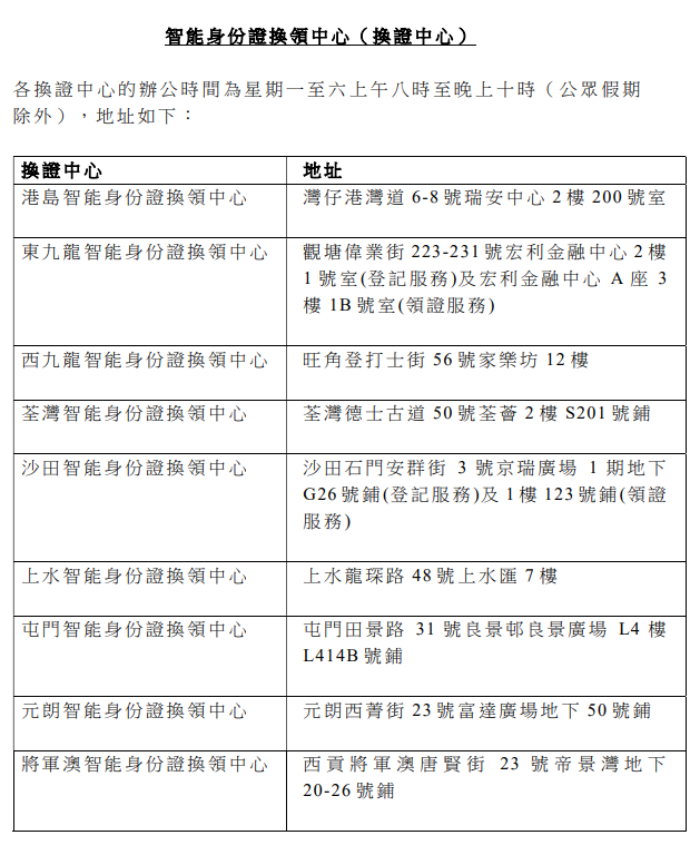 至於年滿11歲或18歲的香港居民,他們須在11歲或18歲生日後的30天內到人事登記辦事處登記領取身份證。如果有關人士身在香港以外地方,則無須趕回香港登記,他們亦可在返港後30天內向人事登記辦事處提出申請。 “到訪院舍換證服務”將不受換證中心服務期限影響。入境處人員會繼續到訪合資格院舍,為所有合資格而仍未換證的院友提供上門換證和派送新證的服務。 為更流暢地於換證中心辦理換證手續,申請人可使用入境處流動應用程式、登入網站www.gov.hk/newicbooking或致電24小時電話預約服務熱線2121 1234,預約辦理換證手續。入境處呼籲申請人在使用流動應用程式或於網上預約時預先填寫表格,以便更快捷地辦理換證手續。(完)