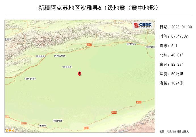 香港中通社1月30日電 據中國地震台網正式測定,30日7時49分在中國新疆阿克蘇地區沙雅縣(北緯40.01度,東經82.29度)發生6.1級地震,震源深度50千米。據中國國家消防救援局官方微博當日8時42分消息,震中20公里範圍內人口極其稀少,目前未接到人員傷亡或房屋倒塌相關警情。