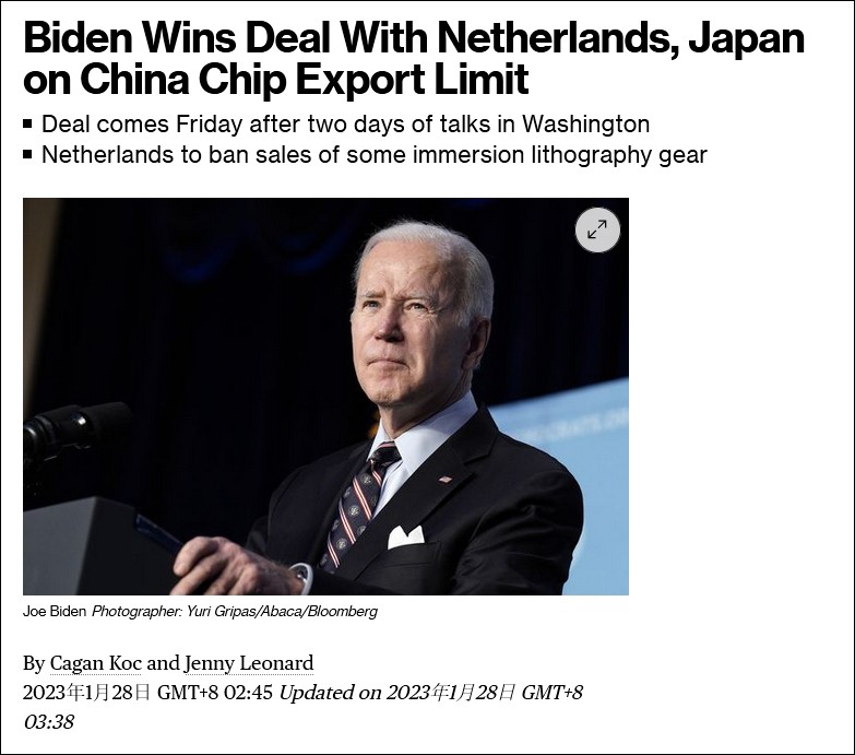 彭博社報道截圖 在此次美日荷達成的“神秘協議”中,總部位於荷蘭的阿斯麥(ASML)成為關注的焦點。“雅虎財經”29日報道稱,荷蘭政府將擴大對阿斯麥的限制,阻止其出售部分極紫外光刻機(EUV)給中國,日本政府也會對光刻機龍頭尼康實施類似限制。 關於中國是否能突破三國芯片封鎖?中國專注半導體產業的研究機構“芯謀研究”首席分析師顧文軍在其發表的《2023年國內半導體產業展望》一文中表示,中國半導體行業目前主要面臨技術和國際兩大挑戰:在技術挑戰上,目前中國半導體產品主要集中在中低端領域,半導體產能也主要集中在28納米以上的成熟制程。中高端半導體產品,如CPU、GPU、存儲器等領域幾乎全部依賴進口。據中國海關總署統計,2021年中國半導體進口額度高達4325億美元。在國際政治挑戰上,美國政府力圖將美國半導體企業遷至美國本土、中國台灣、日本以及韓國等控制力所及的地區,并聯合盟友遏制中國半導體發展。 中國最早專注於半導體顯示領域的投資機構“初芯集團”總裁張翀30日表示,目前上海微電子自研28納米光刻機已經取得突破,有機會全面實現國產化。14納米芯片也將實現量產。即使外購這條路被堵死,中國芯片也不會走上絕路。 顧文軍表示,美國的打壓客觀上為中企提供極為寶貴的國內市場資源。以化學機械拋光設備為例,2017年美國應用材料、日本荏原佔據98.1%的國內市場,現在中電科電子裝備集團製造的8英寸拋光設備已經奪回70%的國內市場。中國半導體產業將從2023年的穀底反轉,開始進入上行周期。隨著國際形勢的持續緊張和中國晶圓廠建設的加速,未來三年將成為半導體材料的國產替代黃金窗口期。 荷蘭《電訊報》指出,中國市場占荷蘭阿斯麥去年營收的15%。少了中國買家,等於流失潛力巨大的市場,且禁令將促使中國更積極尋求其他供貨商并自行開發技術,為阿斯麥製造對手。 目前,中國已在世界貿易組織(WTO)對美國對華芯片等出口管制措施提起訴訟。 針對美日荷三國的協議,中國外交部發言人毛寧1月30日表示,美國為了維護自己霸權和私利,濫用出口管制,脅迫、誘拉一些國家組建遏制中國的小圈子,將經貿科技問題政治化、武器化,嚴重破壞市場規則和國際經貿秩序,中方對此堅決反對。濫用出口管制將製造混亂,影響效率和創新,企圖堵別人的路,最終只會堵死自己的路。(完) 【編輯:王軼南】