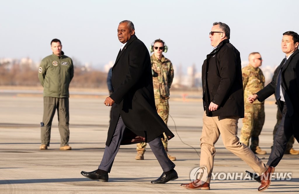 1月30日,美國防長官奧斯汀抵達韓國京畿道烏山空軍基地。圖源:韓聯社 奧斯汀表示,美韓兩國重啟有關延伸威懾的雙邊協商機制,確認戰略調整,通過跨政府層面的接觸不斷加強延伸威懾力量。美方正謀求攜手韓方在韓半島和區域擴張延伸威懾活動及機制的方案。 奧斯汀表示,朝鮮在過去數十年間研發了核武、彈道導彈及其他武器,去年還空前頻繁射彈,這是違反《國際法》及聯合國安理會多項決議的極其危險的行徑。 雙方將在會後共同會見記者介紹會談成果,并向朝鮮發出警告信息。奧斯汀下一站將前往菲律賓。