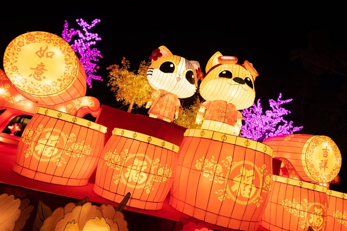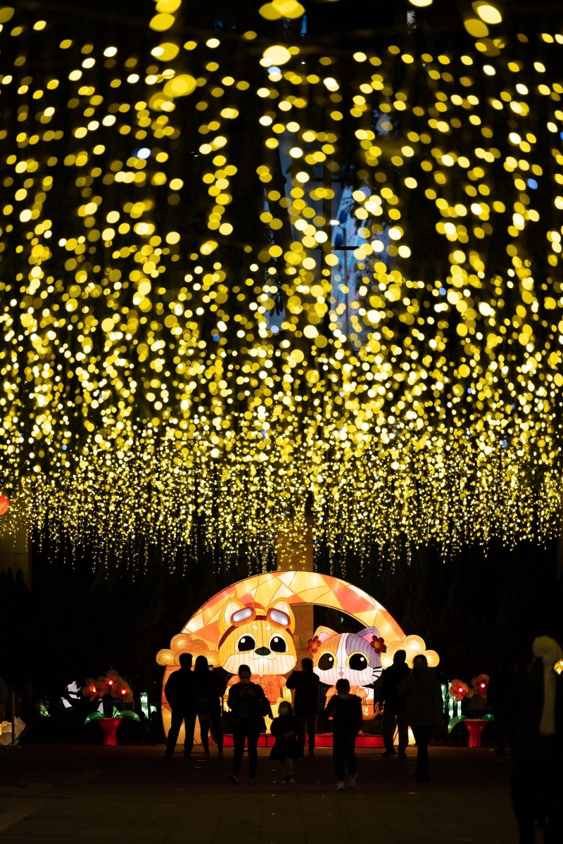 北區公園新界東元宵綵燈展(圖片:政府新聞處) 在荃灣公園舉行的新界西元宵綵燈展,則以“福兔迎春,金貓報喜”為主題,與市民迎春接福。除了“活力仔”和“思文喵”外,熊貓、兔子等動物亦為焦點作品,祝願大家兔年健康富足。燈展特別加入“吉祥走橋”,以繽紛熱氣球點綴公園內小橋,讓市民體驗“走橋”的元宵習俗,象徵祈福驅災。此外,市民亦可在各燈展場地猜燈謎感受節日氣氛。