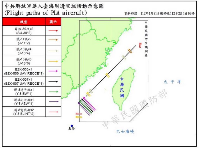 台軍方發布新聞稿指出,“我方”運用任務機、艦及岸置飛彈系統嚴密監控與應處。其中發現有20架次大陸軍機逾越“海峽中線”,最特殊的是,大陸軍方首次派出主力戰機沿“台海中線”從北到南“12處”穿過“台海中線”,是歷來最密集且位置最多一次,是否與新當選的美國國會眾議院議長麥卡錫傳出即將要訪台有關聯,大陸提出嚴重警告有關,值得關注。 根據空軍公佈的“台海周邊空域活動示意圖”,2架次蘇愷30戰機、2架次殲11戰機、4架次殲10戰機、6架次殲16戰機、1架次BZK-005無人機、1架次BZK-007無人機、1架次運8遠干機、1架次運8反潛機、2架次運8電偵機,逾越“海峽中線”、進入西南防空識別區(ADIZ)。(完) 【編輯:紀東】